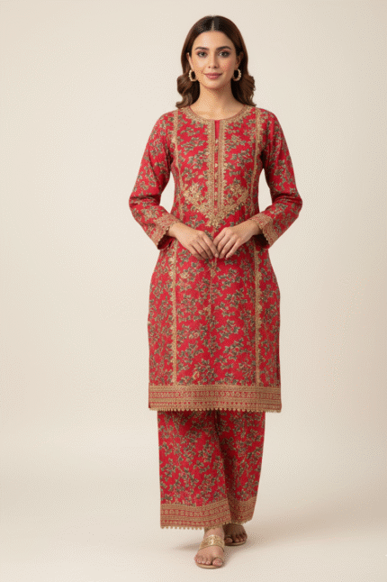 Product Details : Elevate your winter style with our printed two-piece and multicolored ensemble, featuring a digital printed khaddar shirt