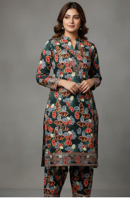 Product Details : Elevate your winter style with our printed two-piece and multicolored ensemble, featuring a digital printed khaddar shirt